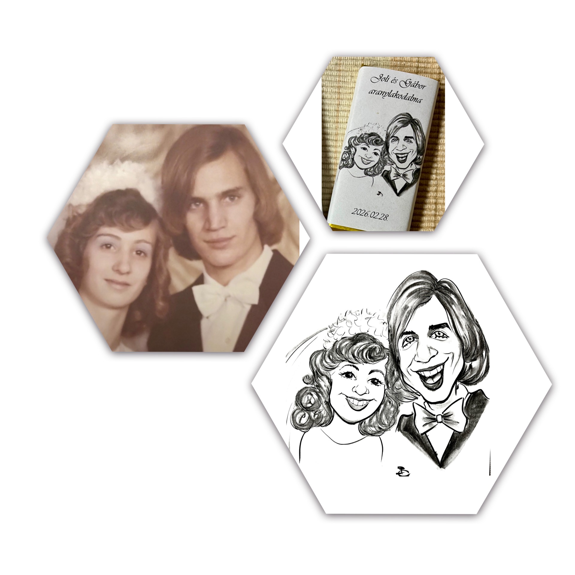 Karikatúra készítése az ifjú párnak, mely alapján meghívó, köszönőajándék, karikatúrás csoki, nyalóka… ültetőkártya készíthető.